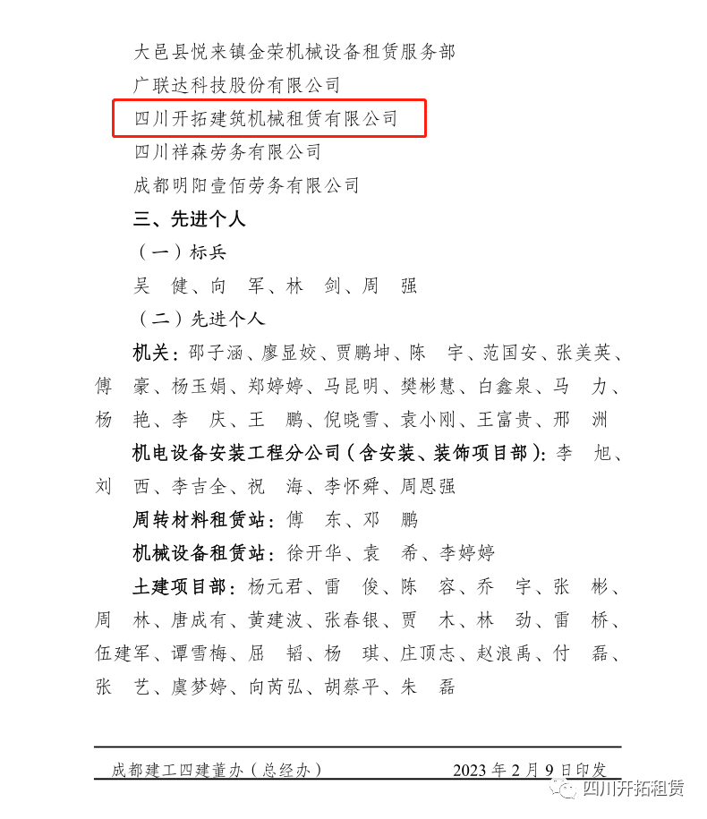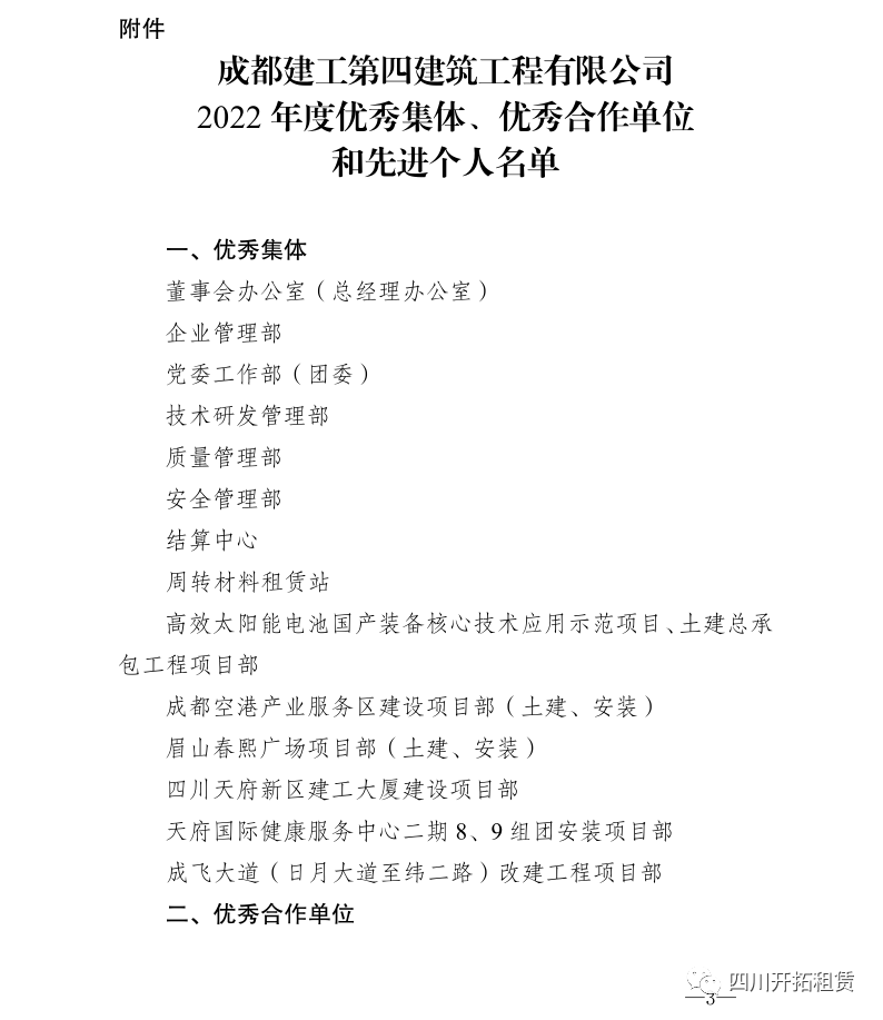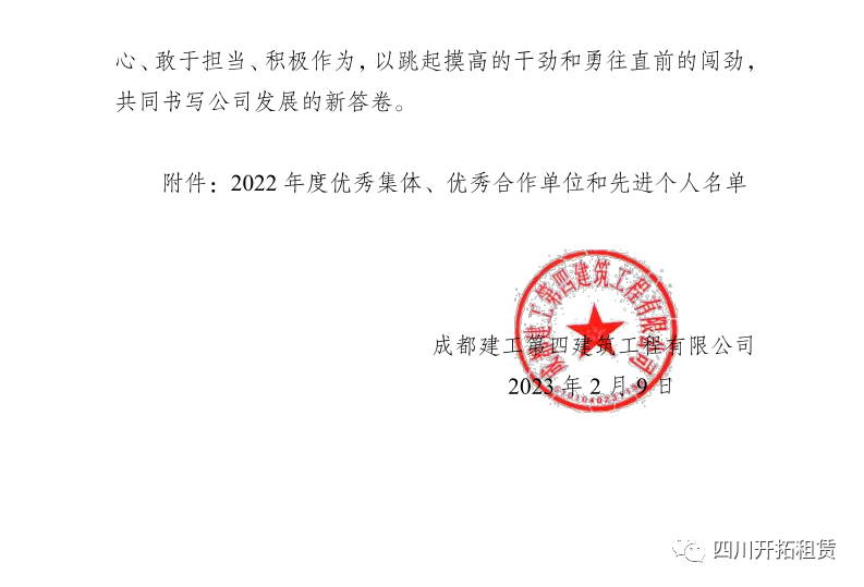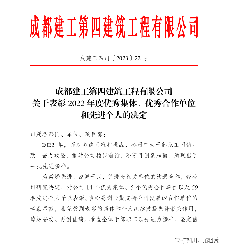 近日,成都建工第四建筑工程有限公司發(fā)布《關(guān)于表彰2022 年度優(yōu)秀集體、優(yōu)秀合作單位和先進(jìn)個(gè)人的決定》文件,四川開(kāi)拓榮獲了“優(yōu)秀合作單位”的表彰。