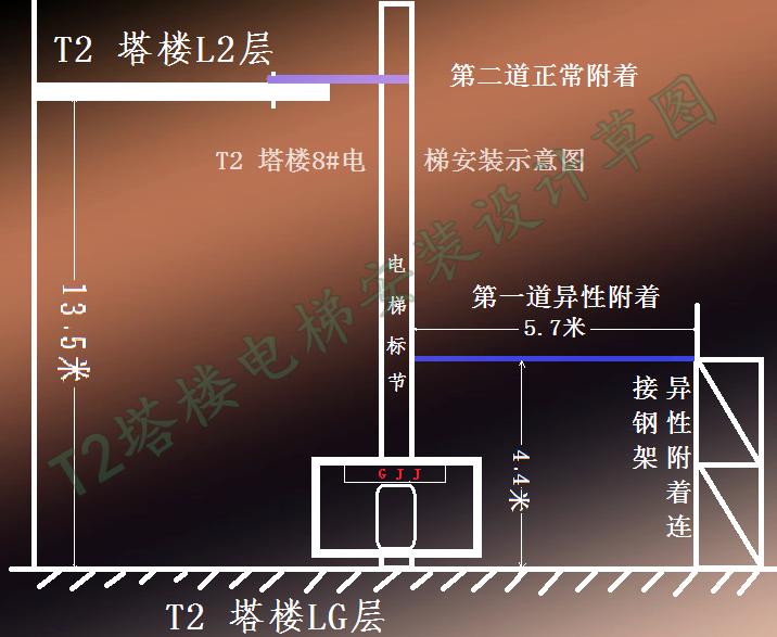 T1 塔樓采用SC270/270G中速電梯一臺,SC200/200TD低速電梯一臺,LG層至L2層高度為13.9米,塔樓含一個(gè)設備夾層,一個(gè)避難層,均需采取特殊異性附著(zhù)。
